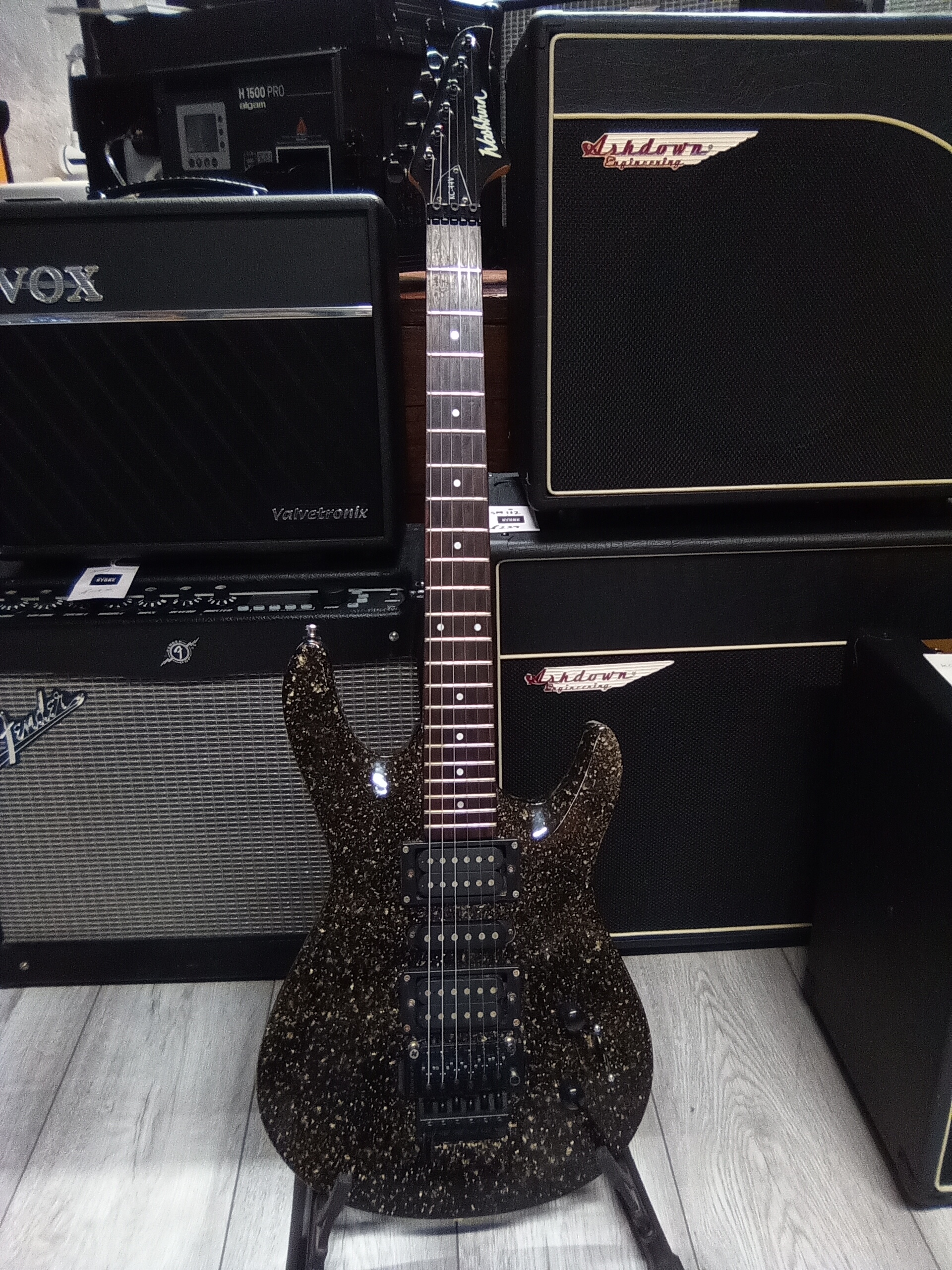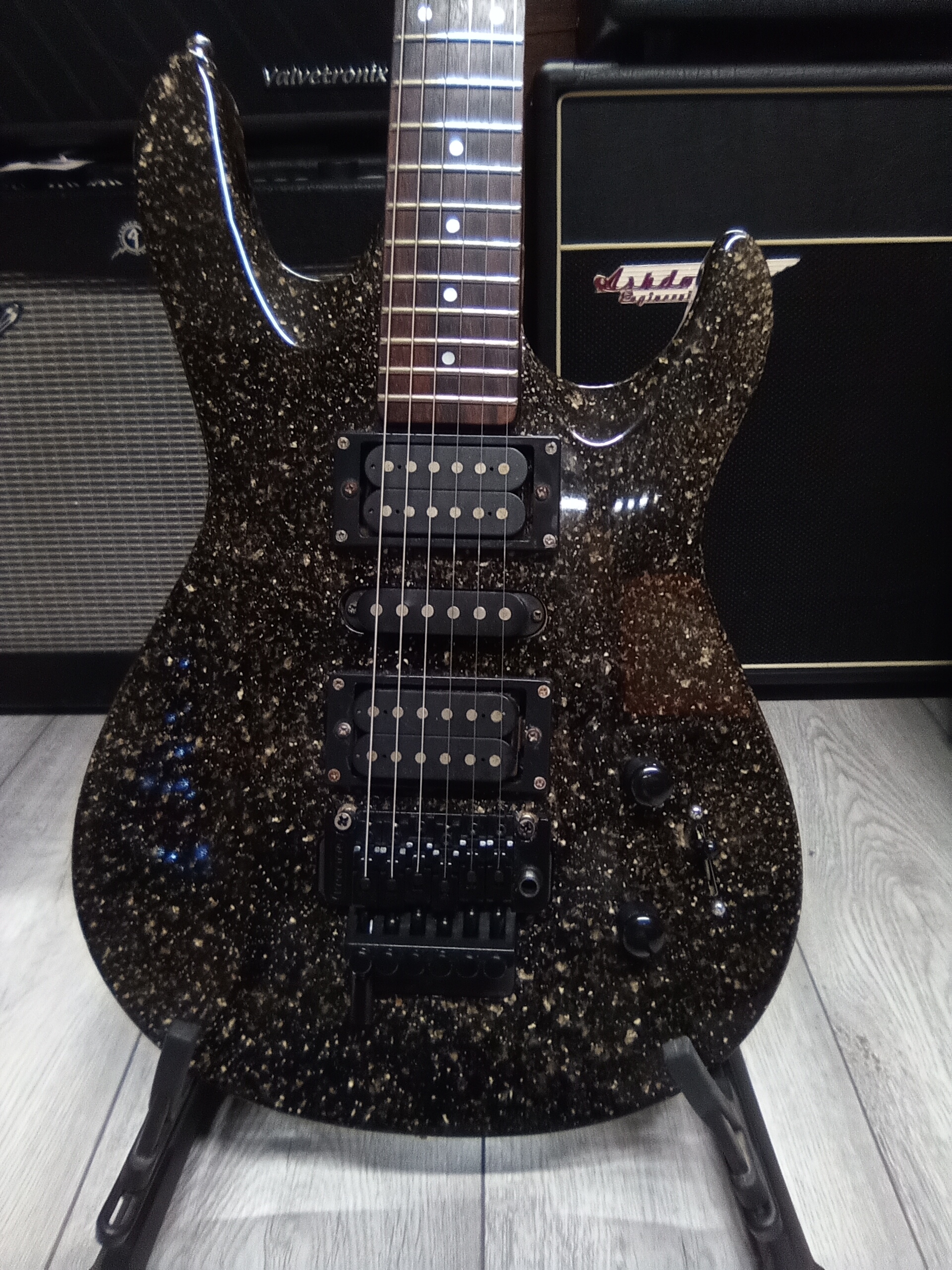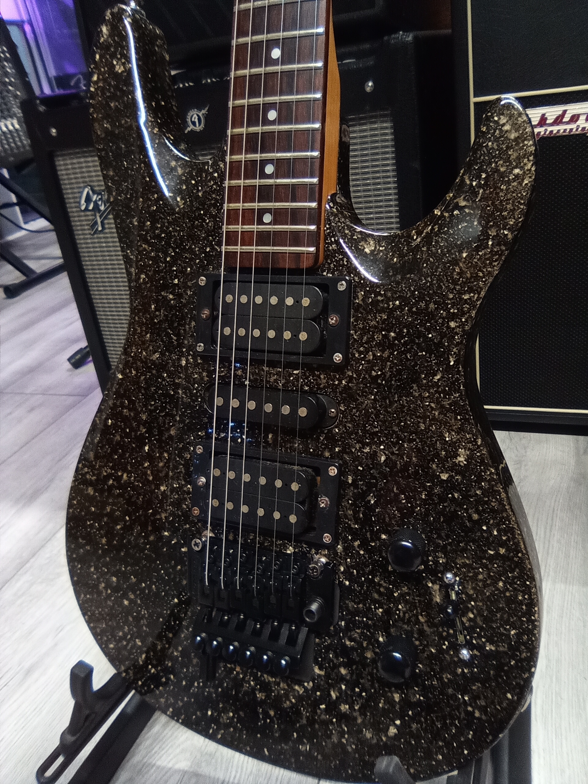 Has upgraded Kramer Floyd rose style trem which can also go to drop d in a flick, guitar really is nicer than pictures show and very Versatile control
